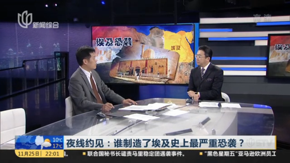 日,上外中东研究所所长刘中民教授应邀参加上海新闻综合频道直播节目《夜线约见》,解读近期埃及西奈半岛恐怖袭击事件。