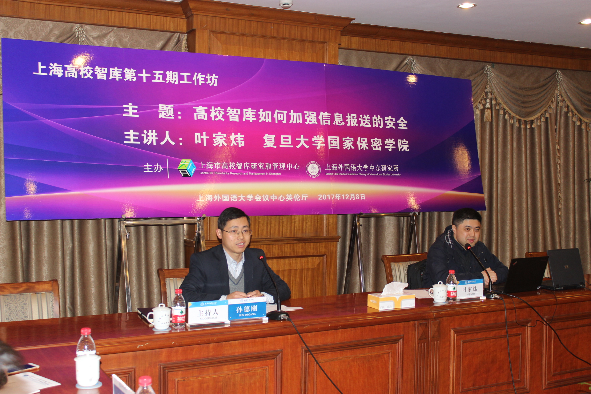 2017年12月8日,上海高校智库第十五期工作坊在上海外国语大学会议中心英伦厅举行。上海外国语大学中东研究所副所长孙德刚研究员主持本次工作坊,主讲人为复旦大学国家保密学院专家叶家炜。此次工作坊主题为“高校智库如何加强信息报送的安全”,来自复旦大学、上海交通大学、上海财经大学、上海对外贸易大学等多家上海高校智库以及上海外国语大学中东研究所、俄罗斯东欧中亚学院等20余名专家学者与会。