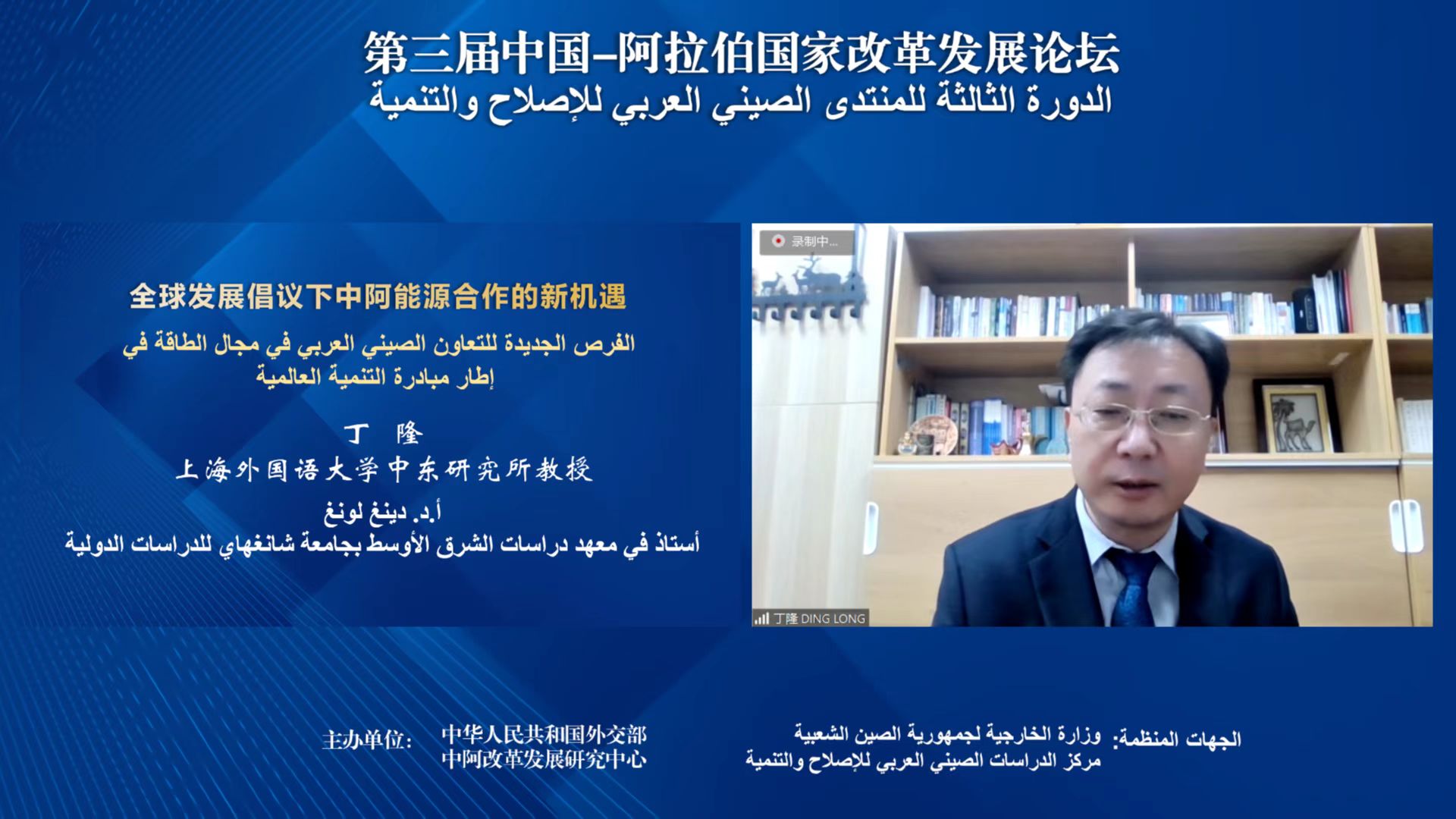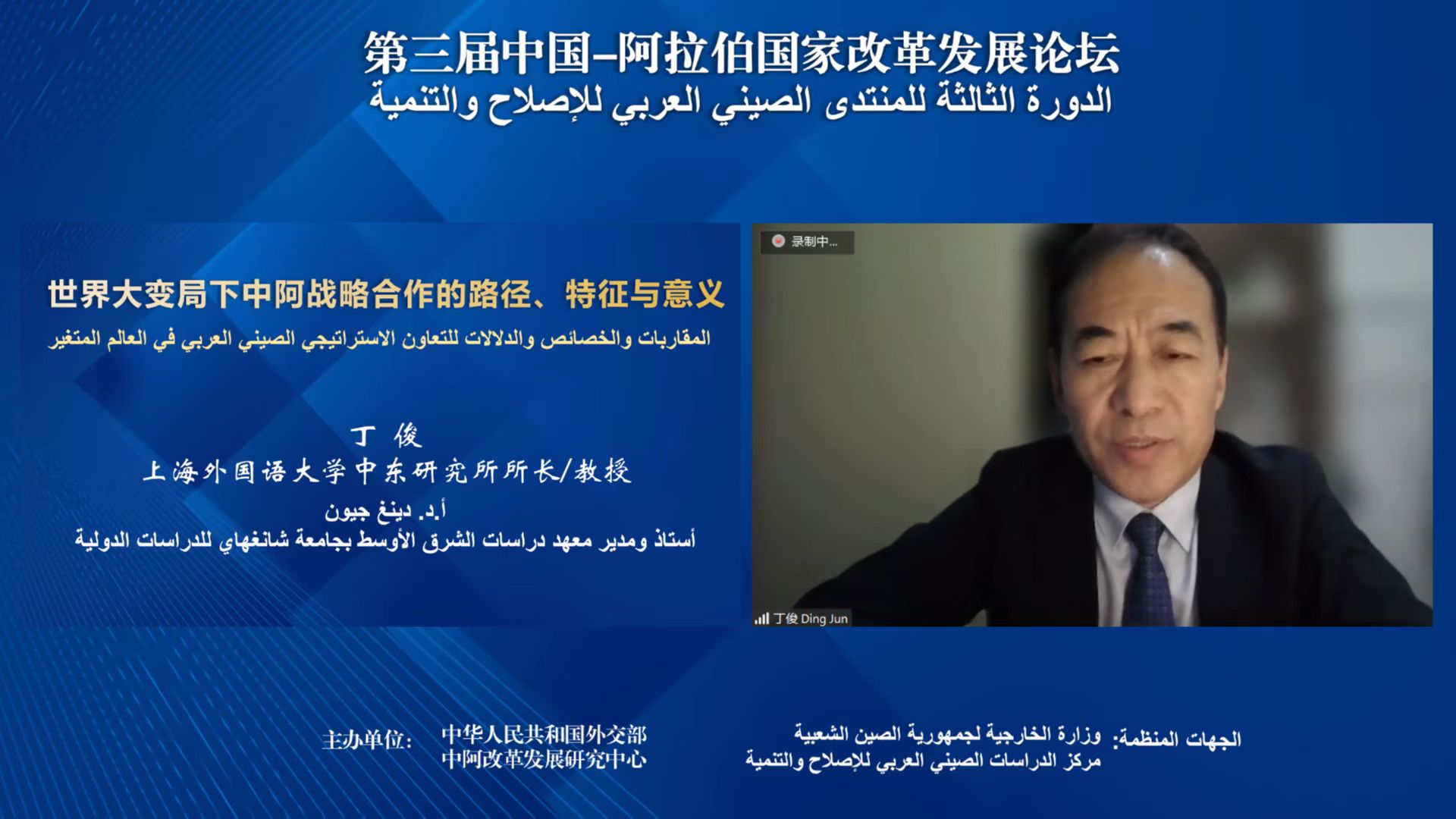 2022年9月8日,外交部依托中阿改革发展研究中心举办第三届中国–阿拉伯国家改革发展论坛,来自中国以及埃及、阿联酋、沙特、卡塔尔、伊拉克、也门、巴勒斯坦、黎巴嫩、苏丹、阿尔及利亚、摩洛哥等国的20余位专家学者参会。中国政府中东问题特使翟隽、阿盟助理秘书长哈利勒·萨瓦迪、阿联酋阿布扎比社会发展局局长穆吉尔·哈伊利、上海外国语大学校长李岩松出席开幕式并致辞,外交部中阿合作论坛事务大使李琛主持会议。沙特科研与知识交流中心主席叶海亚·本·朱奈德和中阿改革发展研究中心理事会秘书长王广大分别主持“加强发展战略对接,携手推进全球发展倡议”、“坚持创新驱动,实现强劲、绿色、健康的发展”两大议题。上外中东研究所所长丁俊教授和丁隆教授应邀参加本次会议,并分别做了题为“世界大变局下中阿战略合作的路径、特征与意义”、“全球发展倡议下中阿能源合作的新机遇”的学术发言。