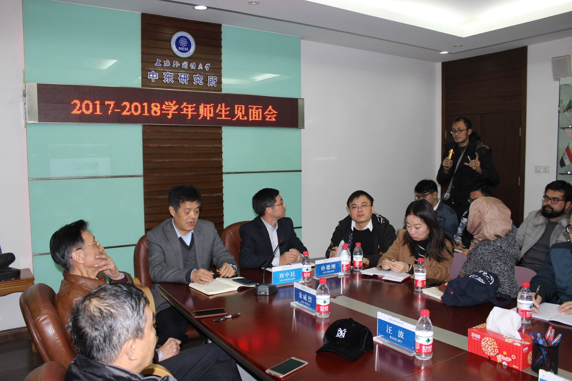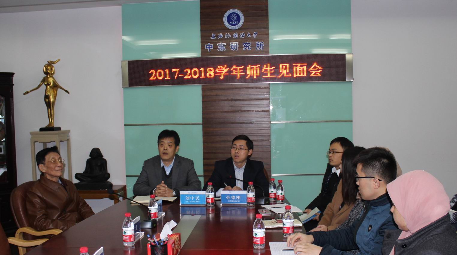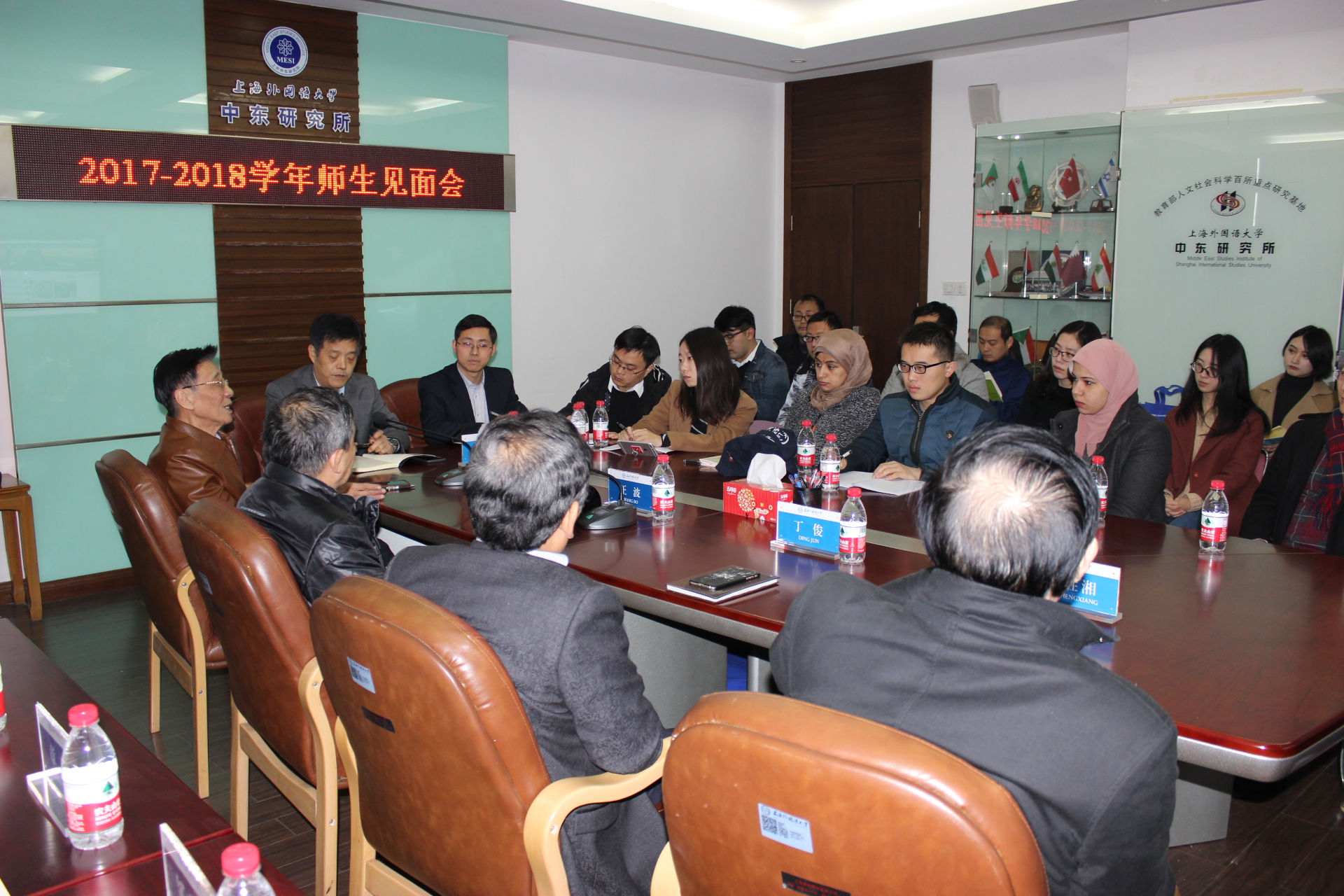 2017年12月22日上午,上外中东所“2017~2018学年师生见面会”在704会议室举行。见面会共分三个议程:所情简介和学生自我介绍、导师代表分享治学经验以及师生互动交流。见面会由孙德刚副所长主持,刘中民所长作会议总结,师生共40余人出席。