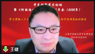 上海外国语大学科研处处长王有勇教授在题为《翻译在构建中国对阿话语体系中的作用》的发言中表示,构建话语体系中的一项重要环节是翻译,是对外传播的最后一公里,好的翻译让中国话语、中国故事、中国声音能够走进去、听进去。陕西师范大学历史文化学院院长李秉忠教授在题为《土耳其世界观与角色观的百年变迁》的发言中回顾了土耳其的世界观和角色关的百年变迁,认为土耳其对自身的角色的认知也反映了世界的变迁。中国社会科学院世界历史研究所毕健康研究员在题为《英国撤军叙事与埃及“三次革命”》的发言中回顾了英国撤军叙事和埃及的三次革命,解析了为什么英国撤军是谎言的问题。西南大学历史文化学院伊朗研究中心冀开运教授在题为《伊朗突厥化历程及其现实影响》的发言中认为,伊朗作为统一的多民族国家,其形成过程是多民族相互交融的结果。山西师范大学历史与旅游文化学院车效梅教授在题为《亚非欧一体化与丝路城市史体系建构》的发言中介绍了关注不同的文明、国家、民族、包括游牧民族对丝绸之路的开拓,突破了对丝绸之路的欧洲中心论解释路径,形成了我们自己对丝绸之路的解释范式。中山大学中东研究中心陈杰教授在题为《当前中国中东研究中的不平衡不充分问题》的发言中认为,中国的中东研究虽然已经取得了不错的成绩,但是存在政治研究不平衡、研究对象不平衡、研究类型不平衡等研究不充分问题。西北大学中东研究所所长韩志斌教授在题为《20世纪中东史学的流变与特点》的发言中,对伊斯兰复兴主义史学、阿拉伯及其他民族主义史学、女性主义史学和移民史学等方面进行了介绍与分析。宁夏大学阿拉伯学院(中国阿拉伯国家研究院)副院长金忠杰教授在题为《新时代中国自主中东研究知识体系的丰富》的发言中认为,中国自主中东研究知识体系的丰富应建构在三个“紧密结合”的基础上。内蒙古民族大学法学与历史学院王泰教授在题为《构建中国自主的埃及史学术体系几个问题的思考》的发言从埃及史研究的角度,指出了应该处理好破与立、道与术、体和用三者之间的关系。上海外国语大学中东研究所舒梦助理研究员在题为《“一带一路”走出去过程中的性别视角》的发言中认为,“一带一路”在走出去过程中要重视性别视角,应对中东等供应链上下游的价值观敏感地区予以更多关注。