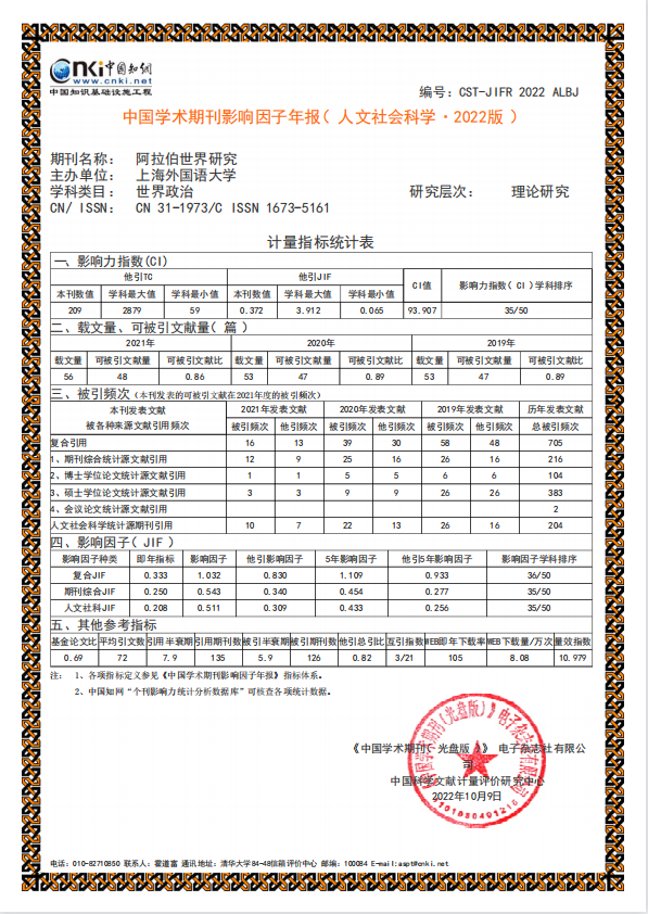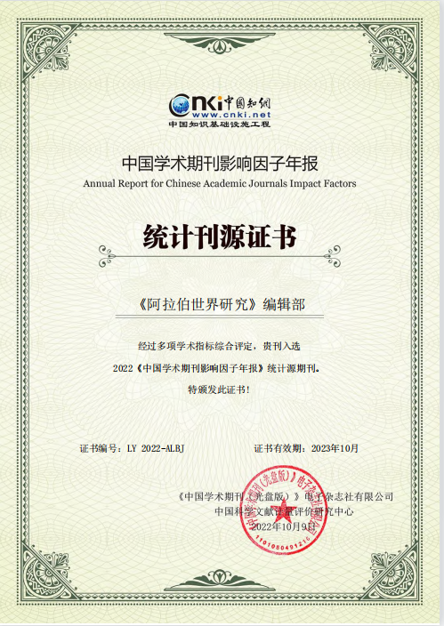 近日,《阿拉伯世界研究》编辑部收到《中国学术期刊(光盘版)》电子杂志社有限公司、中国科学文献计量评价研究中心研制的相关报告,包括2022年《统计源证书》、《中国学术期刊影响因子年报》报表、《指标变化分析报告》及《学术期刊影响力指数说明》等。相关报告显示,经过多项学术指标综合评定,《阿拉伯世界研究》的最新影响因子及学科排序均有提升,影响力指数学科排序位于第35名,并再次入选《中国学术期刊影响因子年报》统计源期刊。