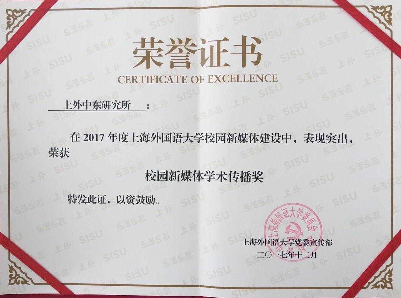 在2017年度上海外国语大学校园新媒体建设中,我所主办的“上外中东研究所”微信公众号(MESI_SISU)表现突出。近日,上外党委宣传部授予中东研究所“校园新媒体学术传播奖”。