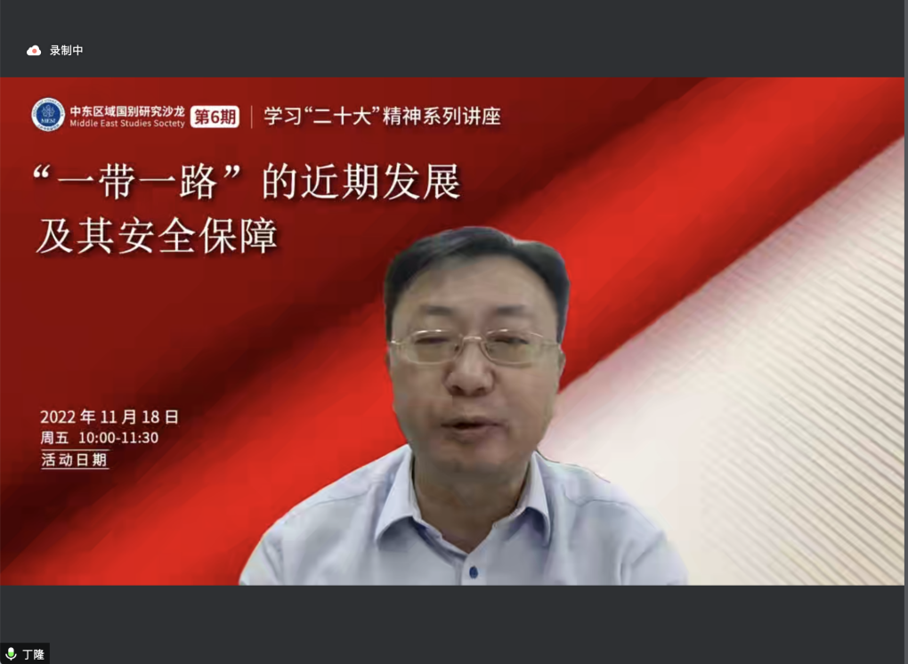 2022年11月18日,上外中东研究所主办的学习“二十大”精神系列讲座“中东区域国别研究沙龙”第6期在线上成功举办。上海社会科学院潘光研究员作了题为“‘一带一路’的近期发展及其安全保障”的学术讲座。