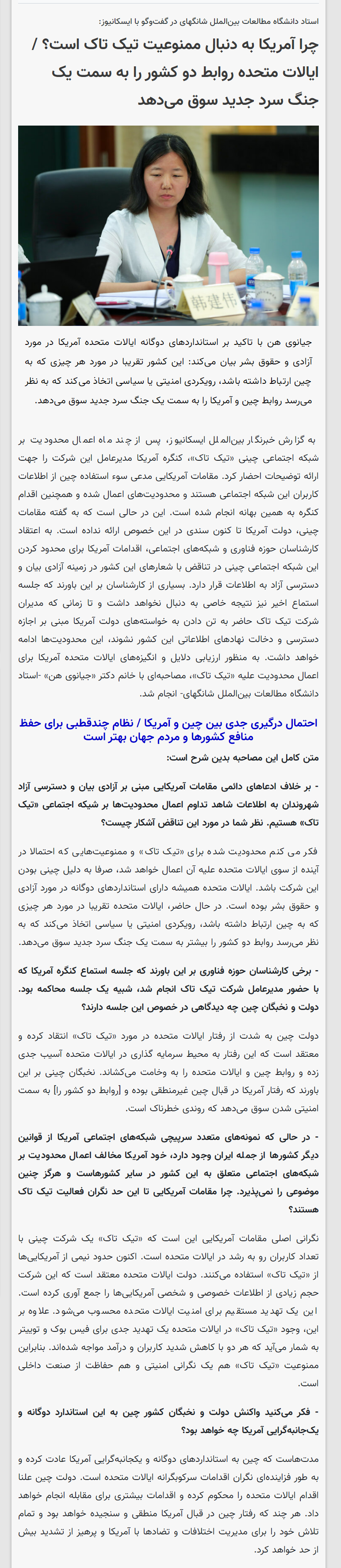 2023年4月6日,上外中东研究所韩建伟副教授就美国召开TikTok听证会接受伊朗ISCA通讯社专访,同日采访被伊朗法尔斯通讯社转载,全文如下: