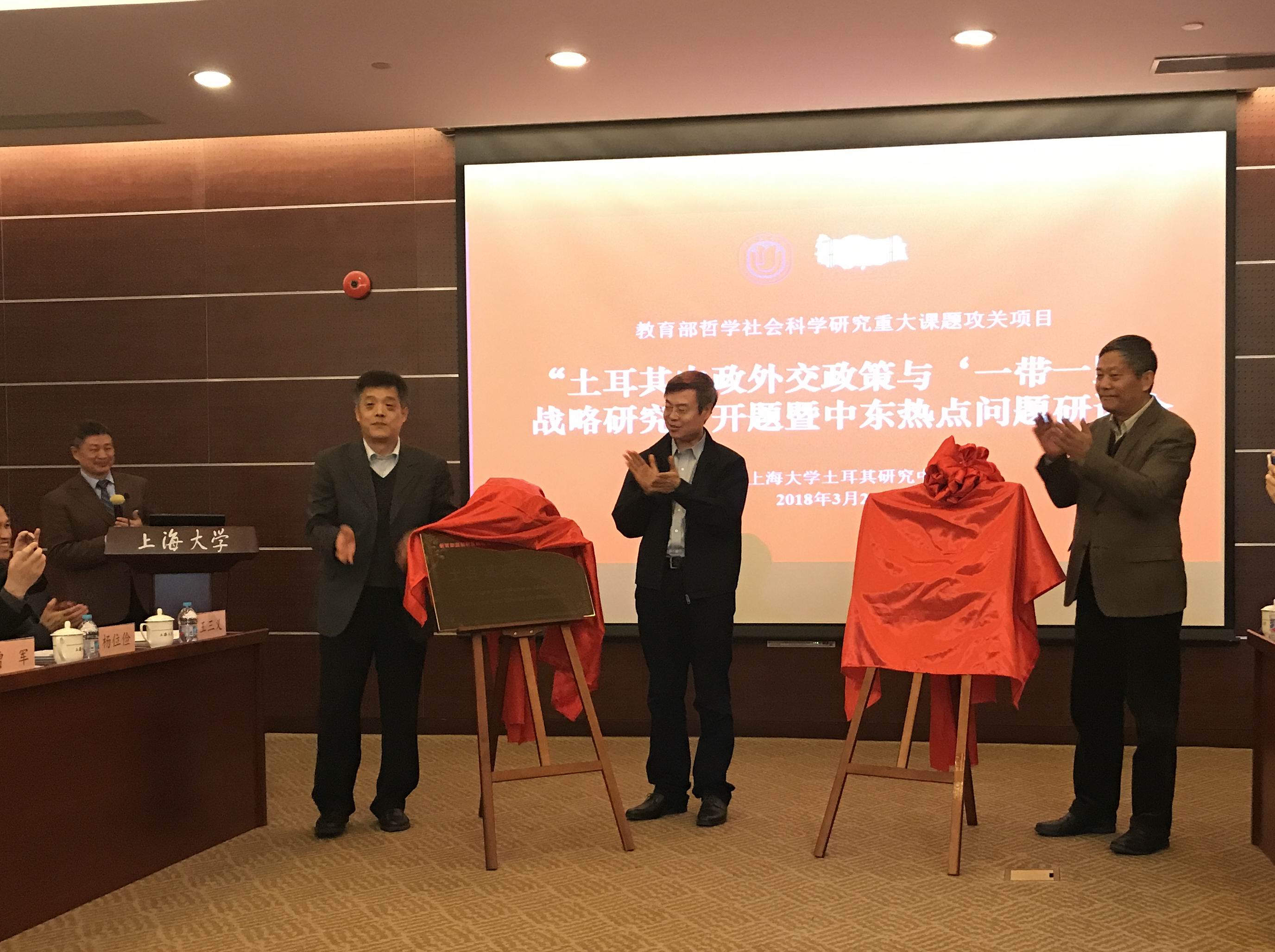 课题分开幕式、开题报告和学术研讨三个环节。开幕式由上海大学研究生院院长、《土耳其内政外交政策与“一带一路”战略研究》课题首席专家郭长刚教授主持,上海大学文科处处长曾军教授、文学院副院长杨位俭教授、中国中东学会会长杨光研究员先后致辞。在开幕式最后环节,上海大学党委书记、校长金东寒院士与中国中东学会会长杨光研究员、上海外国语大学中东研究所所长刘中民教授一起为全球治理研究院、土耳其研究中心的成立揭牌。