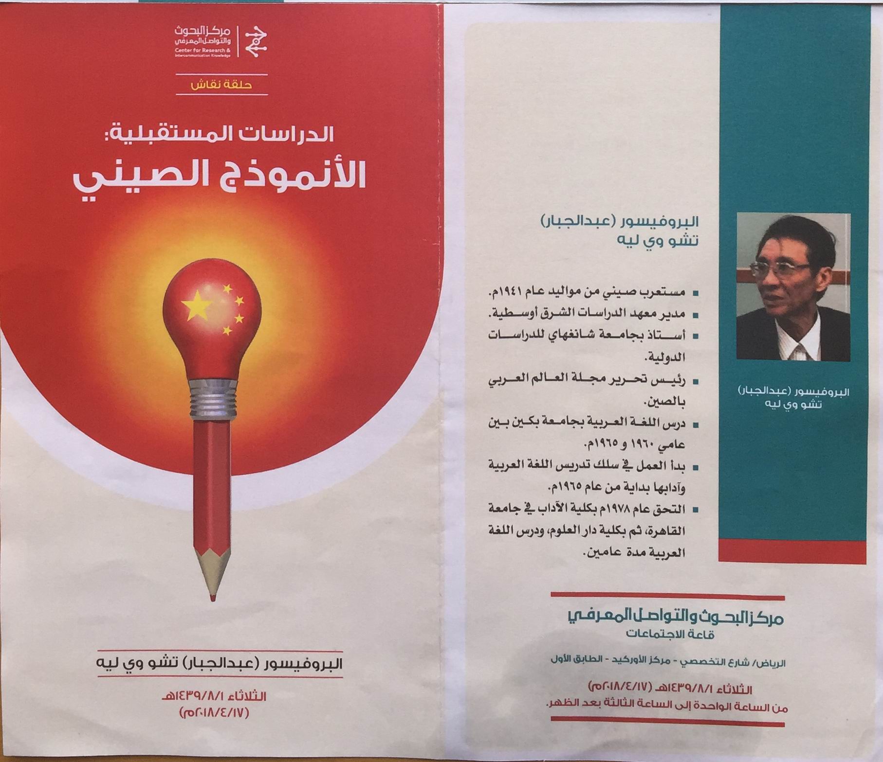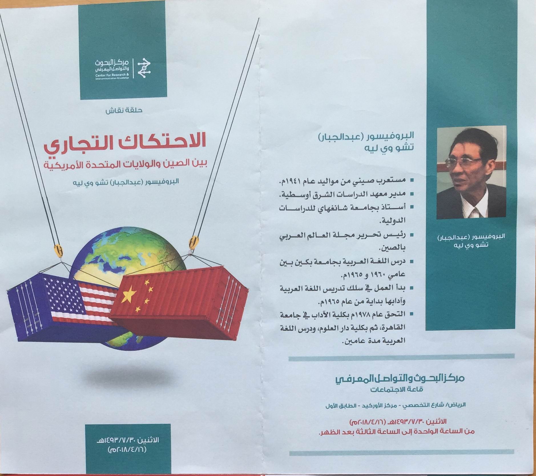 2018年4月中旬,上外中东研究所智库主任朱威烈教授应邀访问了沙特阿拉伯智库学术与知识沟通中心(Center for Research & Intercommunication Knowledge),并与该研究中心负责人就双方开展合作等相关议题进行了沟通交流。访问期间,朱威烈教授还就中美贸易摩擦与中国未来发展议题分别于16日、17日在该智库作了两场学术报告。