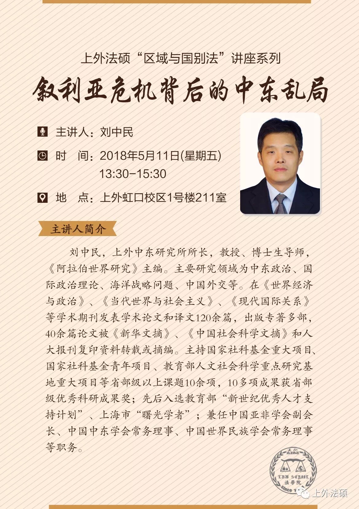 2018年5月11日,上外中东研究所所长刘中民教授作客上外法学院举办的法律硕士“区域与国别法”系列讲座,为50余位同学作“叙利亚危机背后的中东乱局”的专题讲座。