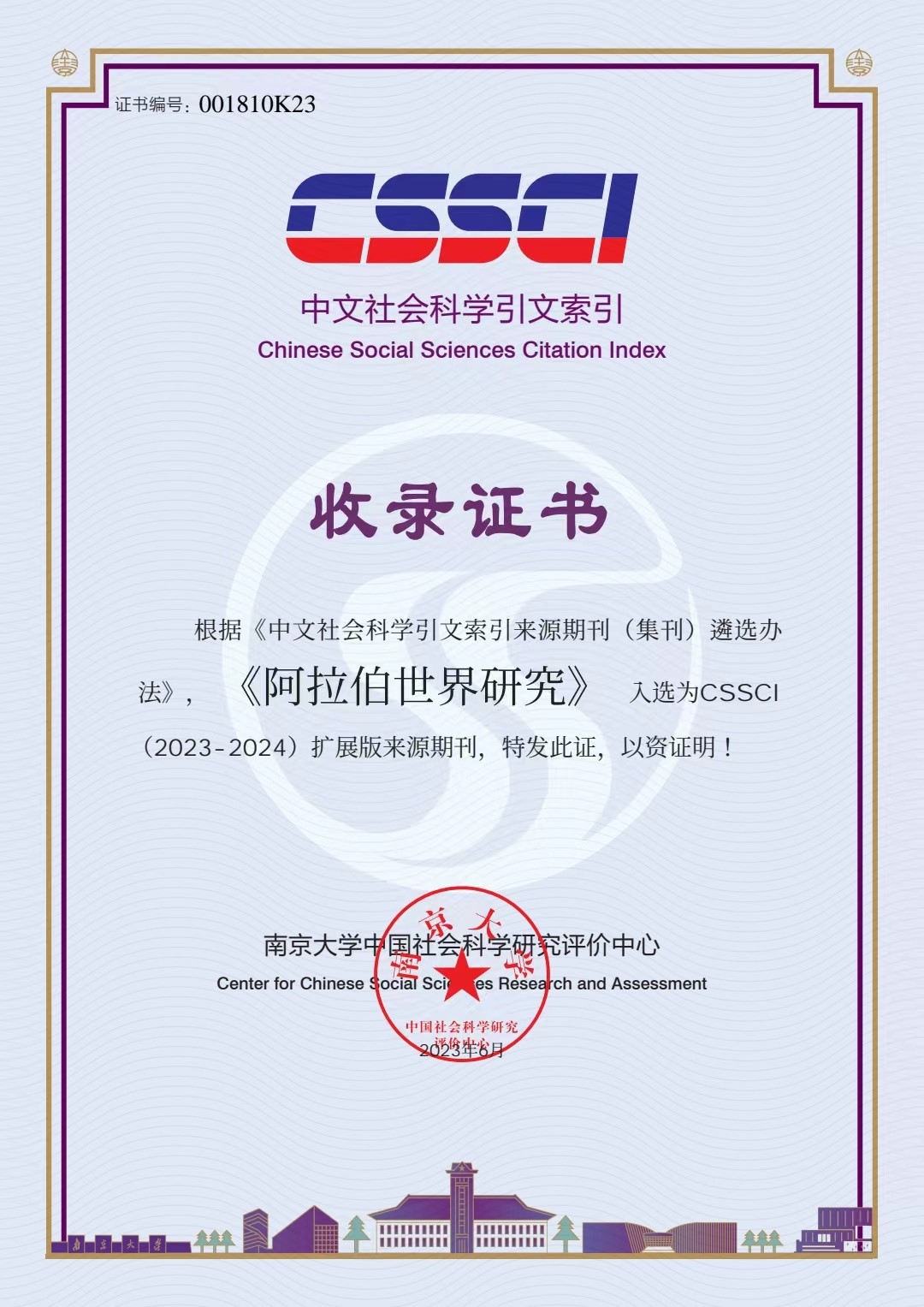 据南京大学中国社会科学研究评价中心2023年6月发布的消息,上海外国语大学中东研究所学术期刊《阿拉伯世界研究》再度入选“中文社会科学引文索引”(CSSCI)扩展版来源期刊目录(2023-2024)。这是自2008年以来,《阿拉伯世界研究》连续第7次入选该数据库。
