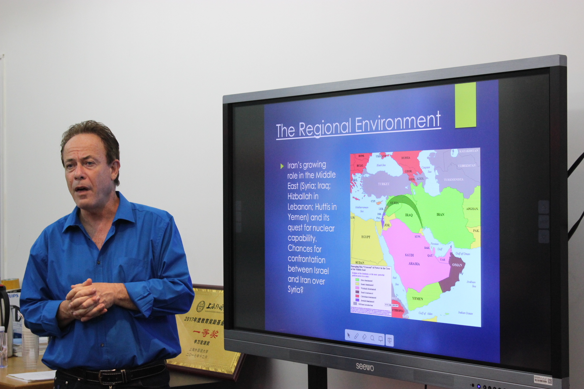 2018年5月18日下午,以色列希伯来大学伊斯兰和中东研究系艾利·伯德(Elie Podeh)教授访问上外中东研究所,并作了题为“后‘阿拉伯之春’时代以色列的中东政策”的学术讲座。此次讲座由中东研究所章远副研究员主持,中东研究所孙德刚、余泳、韩建伟、邹志强,东方语学院希伯来语系系主任杨阳副教授等所内外师生近20人出席讲座。