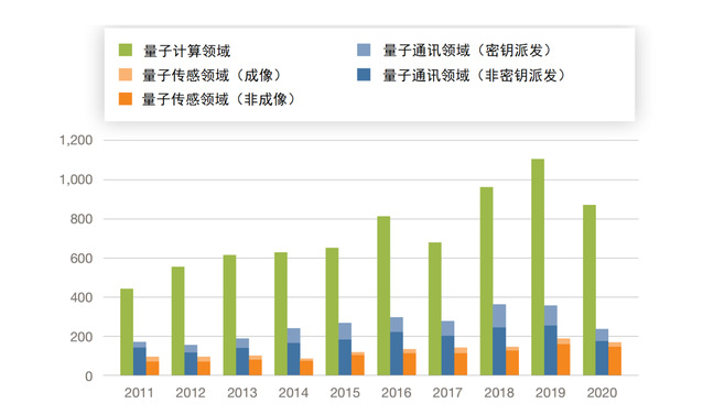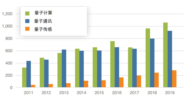 美国在量子技术三个领域的应用年增长率如表2所示、其年度出版物数量的变化与图2所示。在三个领域中,美国量子出版物数量呈增长趋势。2019年,三个领域的总体出版数量是2011年总数的两倍多。