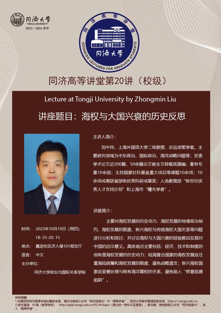 2023年10月19日晚,上外中东研究所刘中民教授应邀在同济大学嘉定校区作学术讲座,此次讲座为“同济大学高等讲堂第20讲”。