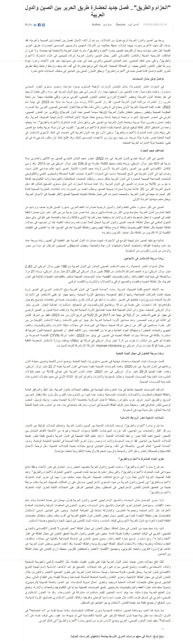 2023年10月16日,上外中东研究所丁隆教授在《今日中国》(阿拉伯文版)2023年第10期发表文章《“一带一路”:中阿丝路文明交往新篇章》(译),全文如下: