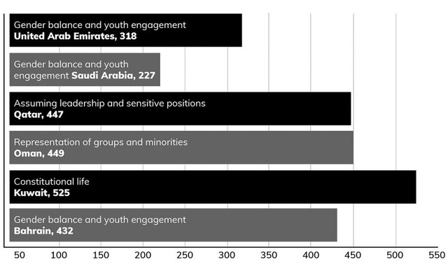 这种差异和梯度需要更细微的术语——或一个仪表盘。位于伦敦的智库海湾之家(Gulf House)发起的“政治参与指数”(The Political Participation Index)就是后者的一个很好的例子。它评估了6个国家在政治参与方面的10个维度,显示了不同“君主制”之间的巨大差异(相对标准偏差为25%)。