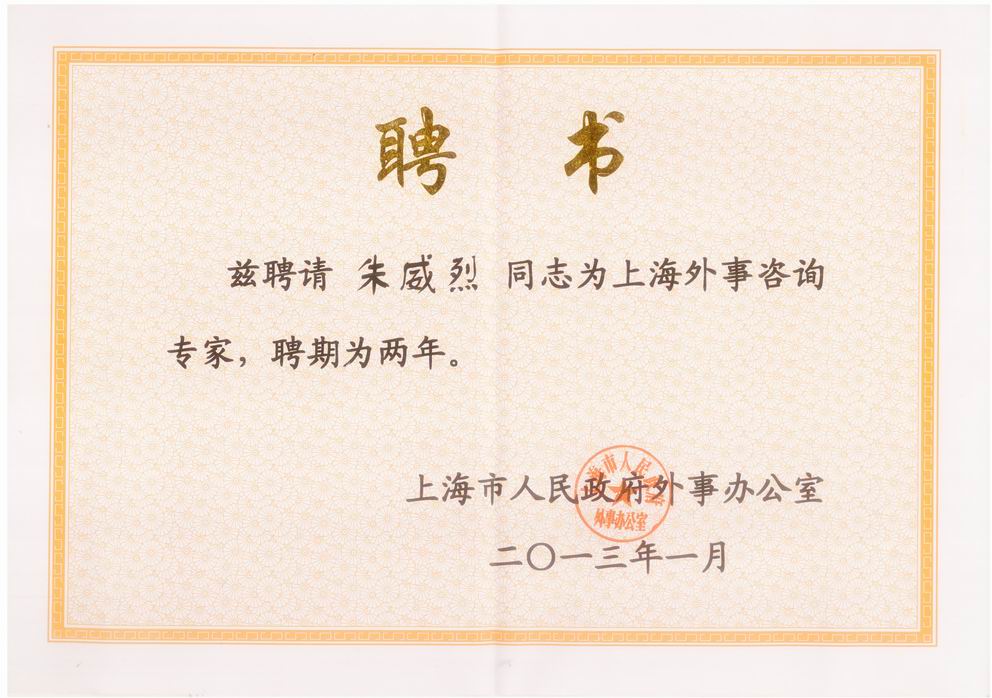 月,中东研究所名誉所长朱威烈教授被上海市人民政府外事办公事聘为上海外事咨询专家,聘期为两年。