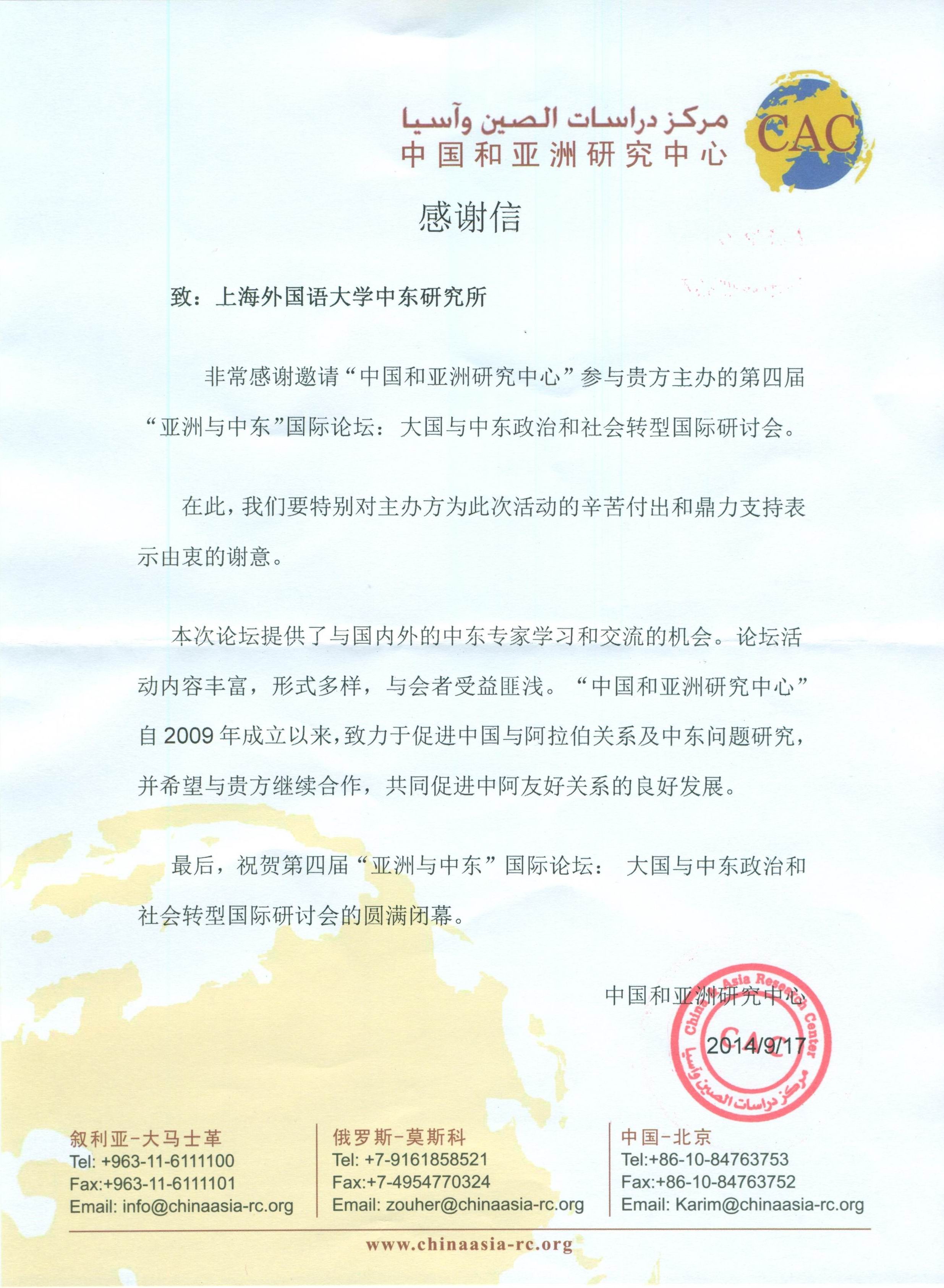 2014年9月17日,中国和和亚洲研究中心致函上海外国语大学中东研究所,对中东所为举办第四届“亚洲与中东”国际论坛——“大国与中东政治和社会转型”国际学术研讨会付出的努力和提供的支持表示由衷谢意,并祝贺本届论坛圆满闭幕。