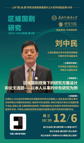 2023年12月6日晚,受上外研究生院邀请,上外中东研究所刘中民教授为上外研究生作学术讲座。讲座题目为“区域国别视野下的研究方案设计和论文选题——以本人从事的中东研究为例”,来自全校的300余位研究生在现场以及收看视频的方式听取了讲座,讲座由研究生院副院长江松主持。