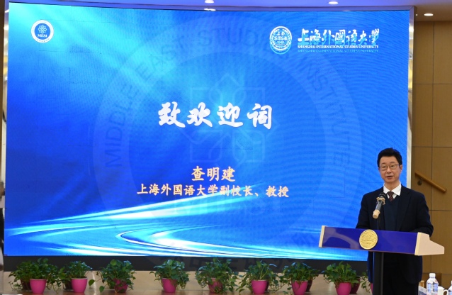 (图为上海外国语大学副校长查明建教授致欢迎辞)