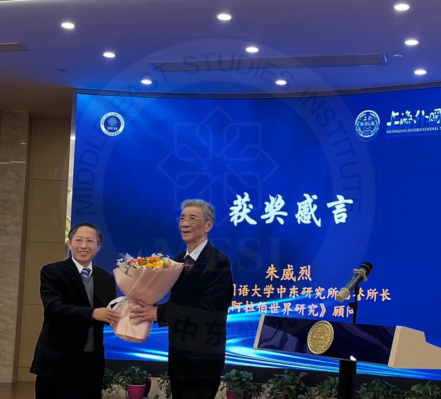 开幕式上,上海社会科学院国际问题研究所研究员、《国际关系研究》主编、中国中东学会副会长余建华研究员代表与会专家学者,向朱威烈教授致贺辞并献花。余建华研究员向朱威烈教授荣膺两项大奖表示热烈祝贺。他说,朱威烈教授治学执教半个多世纪,在倡建中国特色中东学、促进中阿文化交流等各方面做出了卓越贡献,获此殊荣,实至名归。同时,这也是中东研究学界的荣耀,可贺可庆。朱威烈教授在发表获奖感言时表示,能取得这些成绩、获得这样的荣誉,离不开党和国家的关怀关爱,离不开学校的长期支持。作为一生执教、一生在学之人,为国育人、以学报国是始终不渝的初心使命,构建中国特色的中东学和自主知识体系任重道远。