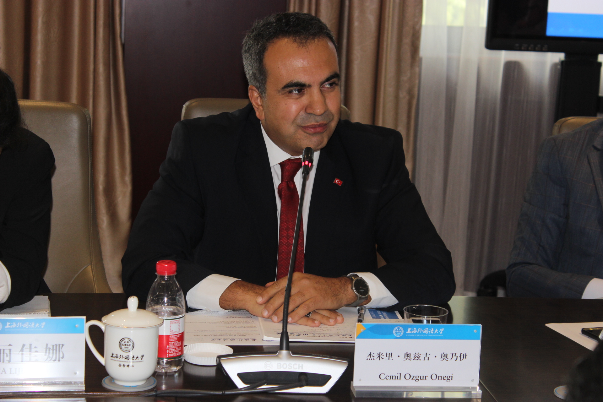 2018年10月15日,土耳其伊兹密尔省副省长杰米里·奥兹古·奥乃伊率领的土耳其伊兹密尔省和名誉领事友好代表团一行10人来我校访问交流。校党委书记姜锋带领中东研究所及东方语学院研究人员热情会见了代表团一行,并与代表团成员进行座谈交流。中国驻伊兹密尔总领馆副总领事倪晓京等陪同来访。