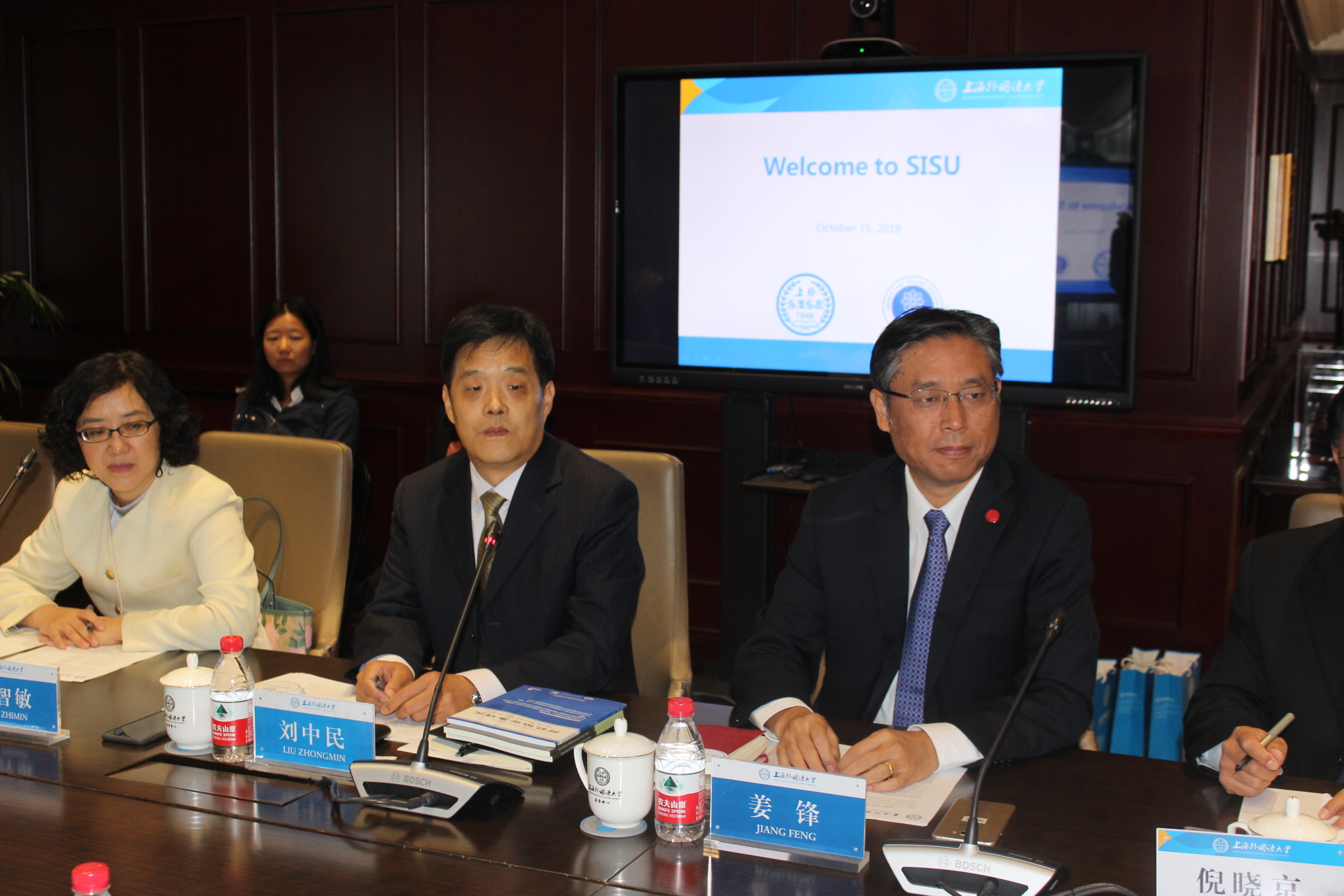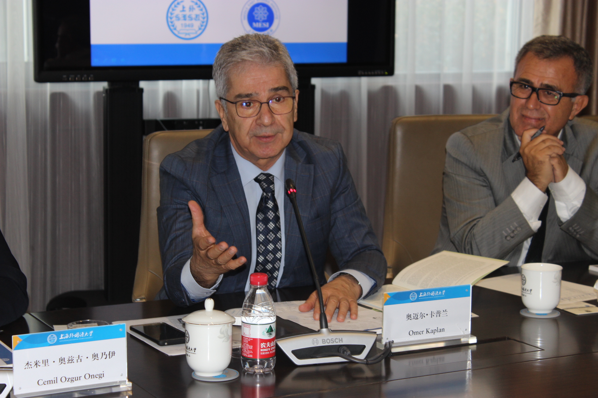 姜锋书记对土耳其客人来访表示热烈欢迎,他介绍了上海外国语大学的发展定位以及近年来与伊兹密尔省、伊兹密尔经济大学等教育机构的合作与交流情况,希望进一步加强双方间的教育学术交流,并向对方赠送了中东研究所主办的中英文期刊。刘中民所长介绍了中东研究所的发展历程、机构设置、学术研究和期刊建设等情况。