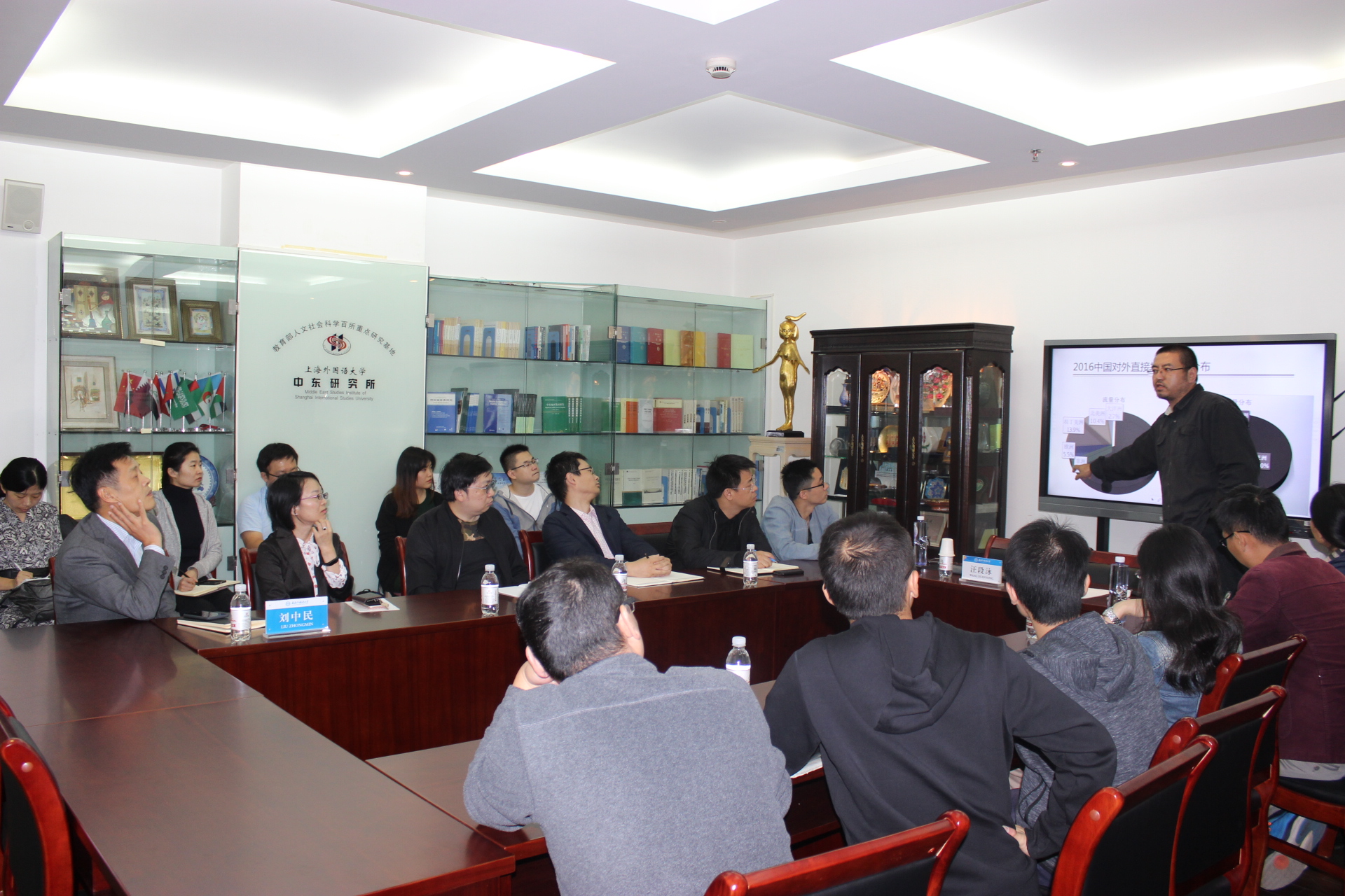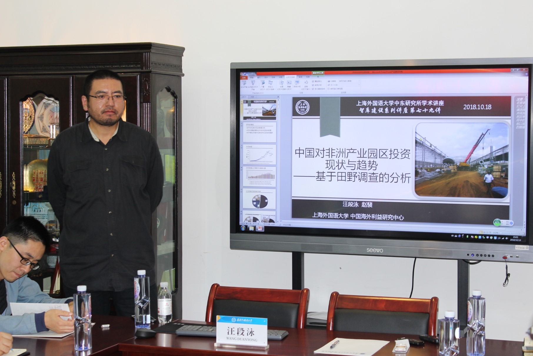 2018年10月18日,中东研究所举办智库系列讲座第79讲,上海外国语大学国际关系与公共事务学院副研究员、中国海外利益研究中心主任汪段泳副研究员以“中国对非洲产业园区投资现状与趋势:基于田野调查的分析”为题,为全校师生作了一场精彩的学术讲座。讲座由中东研究所所长刘中民教授主持,中东研究所钮松、包澄章、潜旭明、赵军、章远、韩建伟、邹志强等研究人员、上外其他院系师生、媒体人士等共20余人出席讲座。