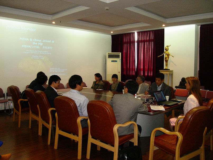 2013年10月21日下午,英国伦敦“阿拉伯观察”(Arabia Monitor)研究与咨询机构创始人、首席经济师Eid博士在“阿拉伯观察”贾一夫先生的陪同下,访问上外中东研究所,并以“中东剧变背景下的中国与阿拉伯经贸关系”为题作学术报告。中东所刘中民所长、钱学文研究员、张金平教授、潜旭明博士、邹志强博士、孙德刚副研究员以及中东所和东方语学院部分学生出席学术讲座。