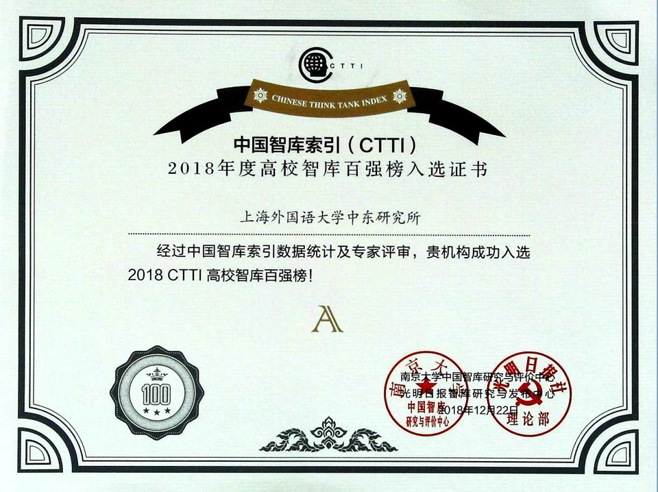 在上午的会议发布阶段,上外中东研究所获得“中国智库索引(CTTI)高校智库百强”(A类)证书证牌,同时位列全部706家CTTI来源智库中“区域研究与国际关系领域智库”PAI值评分Top15榜单(P-智库成果,A-智库活动,I-智库媒体影响力);刘中民教授的论文《在中东推进“一带一路”建设的政治和安全风险及应对》荣获“中国智库索引(CTTI)2018年度精品成果”。