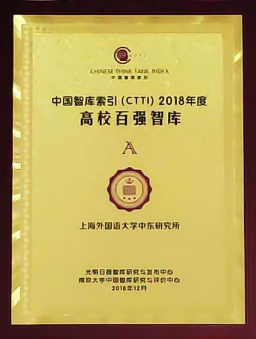 上外中东研究所于2013年9月入选首批上海高校智库;2015年4月成为“一带一路”智库合作联盟理事单位,同年11月成为“一带一路沿线国家研究智库联盟”首批理事单位;2015年11月和2016年12月连续入选“中国智库名录”;2016年12月、2017年12月连续入选“中国智库索引(CTTI)”来源智库,2018年12月入选“中国智库索引(CTTI)高校智库百强榜”;2017年1月加入“教育部人文社科重点研究基地跨学科智库联合体”,11月入选“中国智库综合评价核心智库榜单”;2017年10月和2018年9月连续入选“一带一路”高校智库影响力榜单。