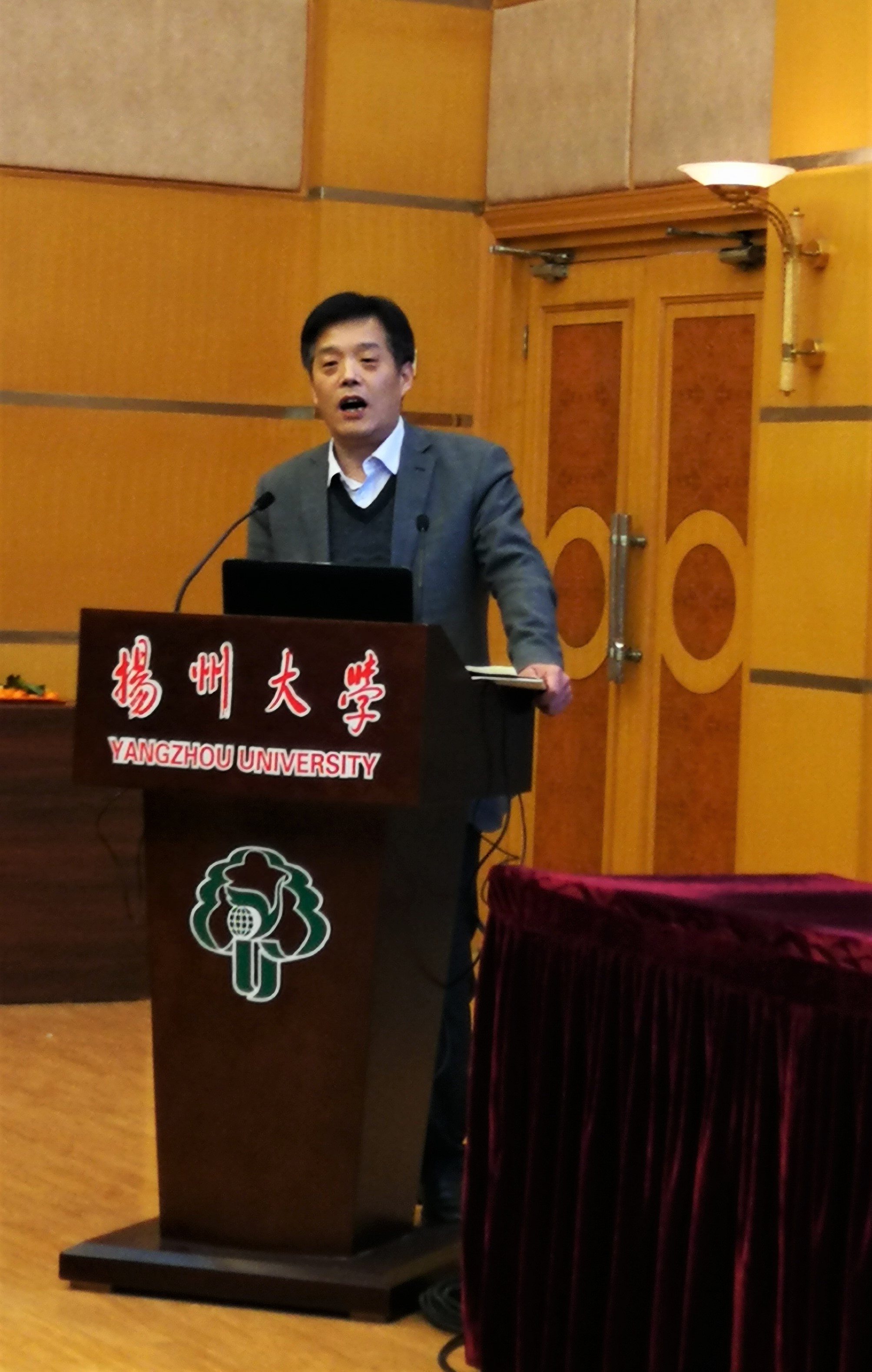 12月29日上午的开幕式由扬州大学外国语学院院长、苏丹研究中心执行主任王金铨主持。随后的大会主题发言环节由北京大学教授、中国非洲史研究会会长李安山,前驻厄立特里亚和卢旺达大使、中国非洲史研究会副会长舒展,上海外国语大学中东研究所所长刘中民,西北大学中东研究所所长韩志斌,《西亚非洲》编辑部副主任、中国亚非学会秘书长詹世明先后作主题发言。刘中民教授的发言题目为“关于加强中东区域与国别研究的几点思考”。