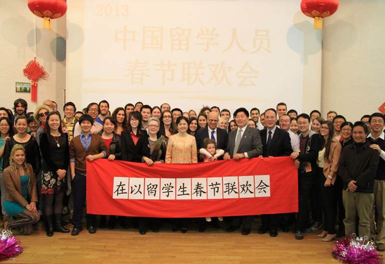 2013癸巳蛇年新春佳节,我所派以留学生盛睿、王畅、王佳尼、赵星华在以色列特拉维夫与使馆工作人员共庆新年。