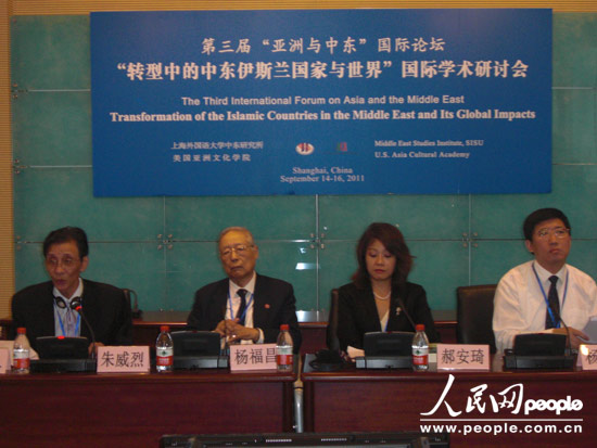 人民网上海914日电(记者王南)第三届“亚洲与中东”国际论坛——转型中的中东伊斯兰国家与世界国际学术研讨会今天在上海外国语大学举行。上海外国语大学副校长杨力,美国国会图书馆亚洲分部助理主任郝安琦,中国外交部前副部长杨福昌出席了研讨会开幕式,并分别发表致词。上海外国语大学中东研究所所长朱威烈主持了开幕式。