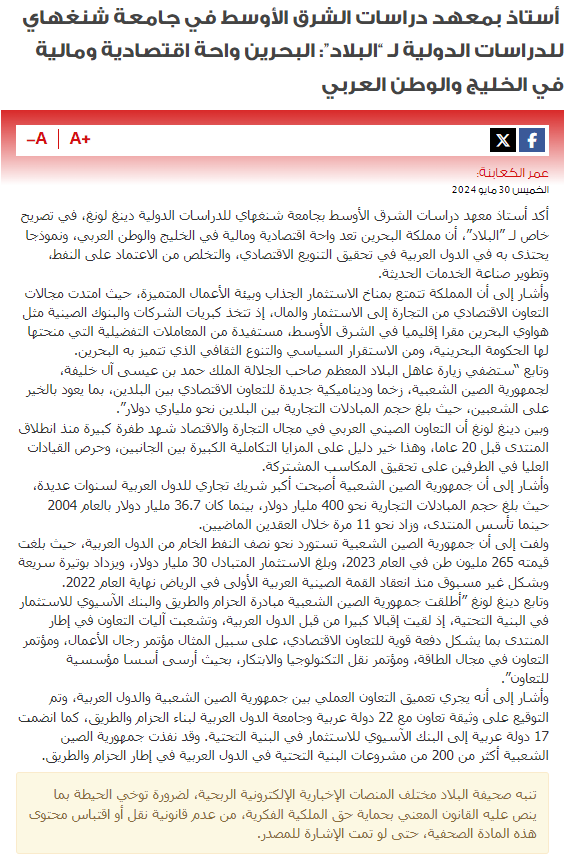 2024年5月30日,上外中东研究所丁隆教授就中阿合作论坛第十届部长级会议和中巴关系接受巴林《祖国报》采访(见《祖国报》2024年5月30日第7版),全文如下:
