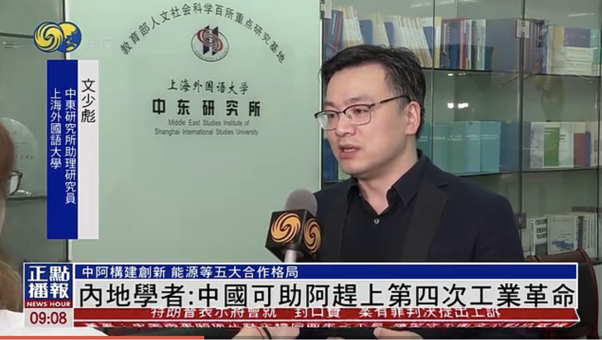 2024年6月1日,上外中东研究所助理研究员文少彪就中阿合作接受凤凰卫视《正点播报》采访(标题:内地学者:中国可助阿拉伯国家赶上第四次工业革命)。