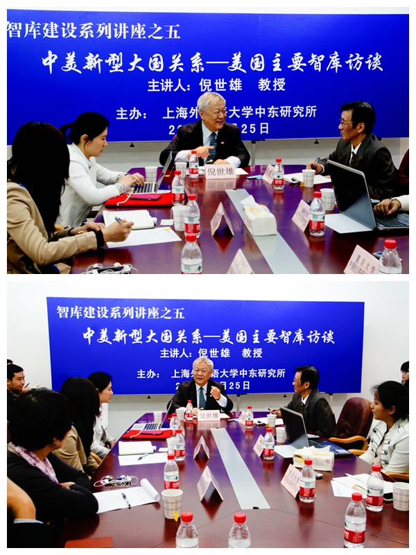 2014年4月25日下午,应中东研究所邀请,复旦大学美国研究中心教授、教育部社会科学委员会委员、中华美国学会副会长、全国高校国际政治研究会副会长倪世雄教授为我校师生作了题为“中美新型大国关系:美国主要智库访谈”的专题讲座。讲座由中东所名誉所长朱威烈教授主持,校党委书记姜锋、上海高校智库代表、上外中东所、国研院、欧盟研究中心、俄罗斯研究中心和其他院系的师生50余人聆听了讲座。