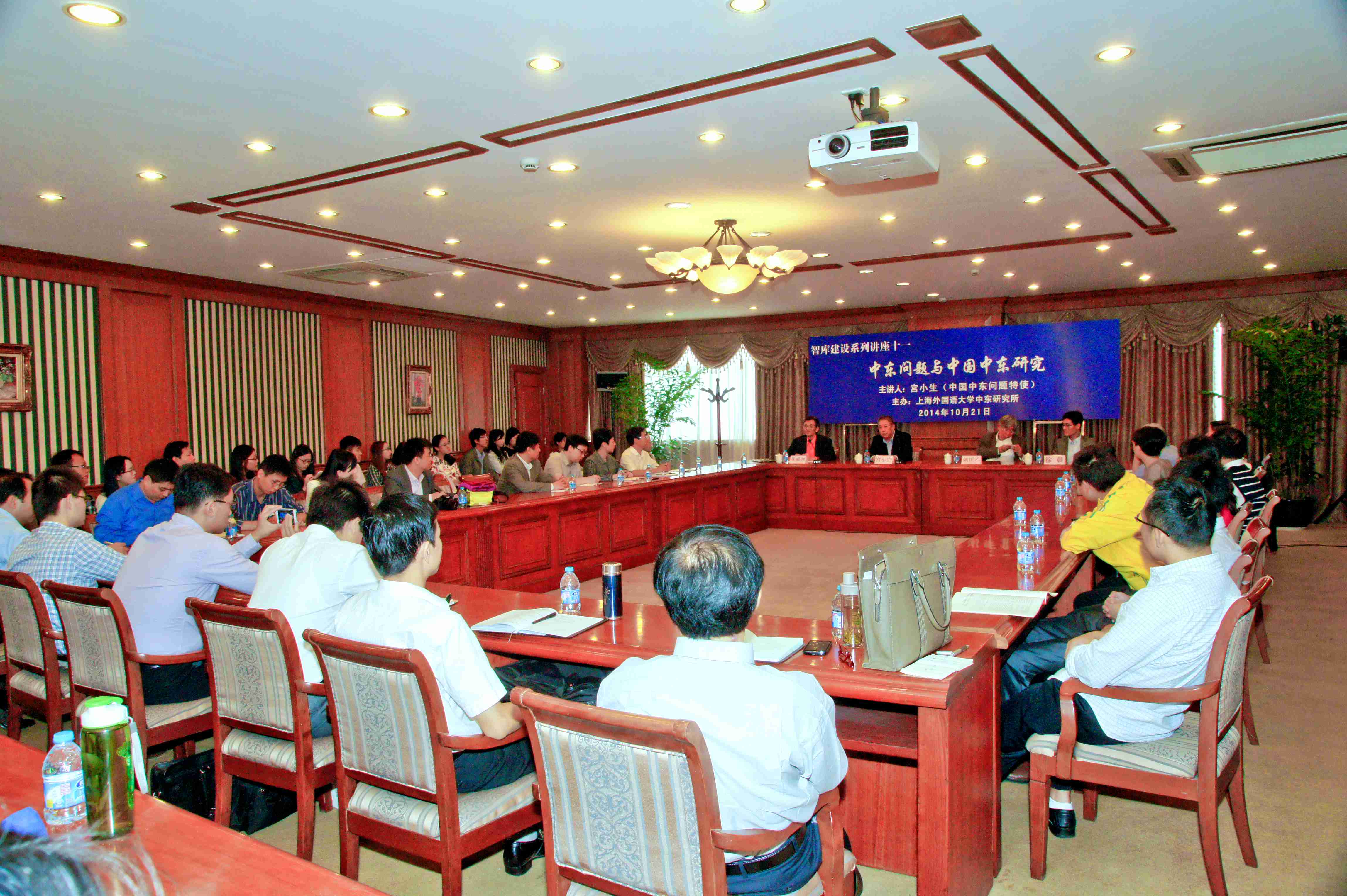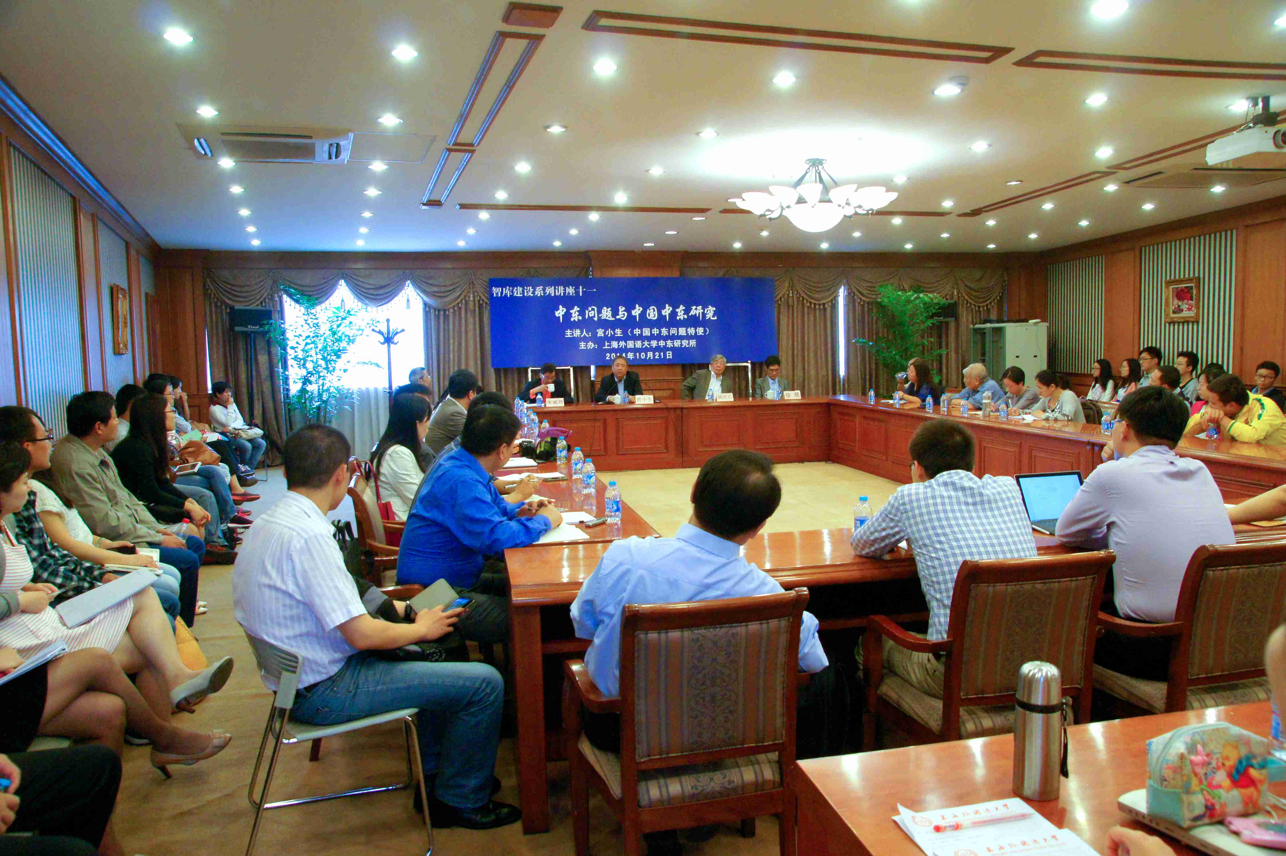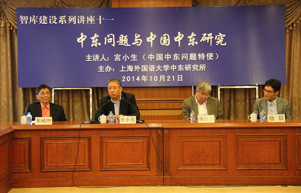 2014年10月21日,中国中东问题特使宫小生应中东研究所的邀请到访上海外国语大学并为师生做了专题报告,主题为“中东问题与中国中东研究”。中东研究所朱威烈教授主持了报告会,中国国际问题研究基金会理事、前驻土耳其大使姚匡乙与中阿合作论坛办公室主任徐晨参赞陪同出席,来自上外中东研究所、国际关系与公共事务学院、东方语学院、国别区域研究中心等部门的师生50余人共同出席了报告会。