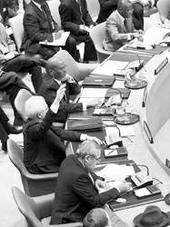 4日,俄罗斯常驻联合国代表丘尔金(举手者)在表决中投否决票