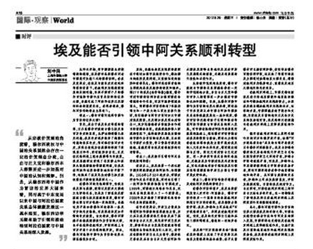 2012年8月29日,中东所所长刘中民教授在《东方早报》发表评论文章《埃及能否引领中阿关系顺利转型》,全文如下: