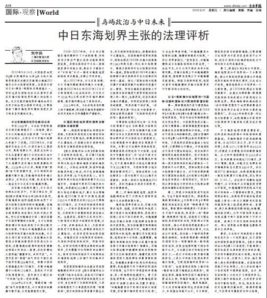 2012年9月21日,中东所所长刘中民教授在《东方早报》发表评论文章《中日东海划界主张的法理评析》,全文如下: