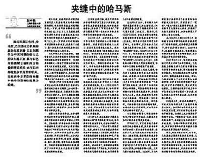 2012年11月20日,中东所所长刘中民教授在《东方早报》发表评论文章《夹缝中的哈马斯》,全文如下: