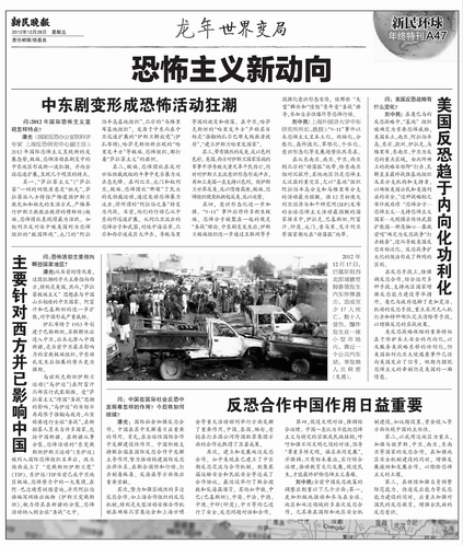 潘光(国家反恐办公室软科学专家上海反恐研究中心副主任):2012年国际恐怖主义呈现新的发展态势,极端、恐怖活动在剧变中的中东地区形成新一波狂潮,并向全球迅速扩展,呈现几个明显的特点。