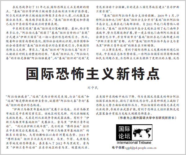 2013年2月5日,中东所所长刘中民教授在《人民日报》发表评论文章《国际恐怖主义新特点》(见《人民日报》2013年2月5日第3版),全文如下:
