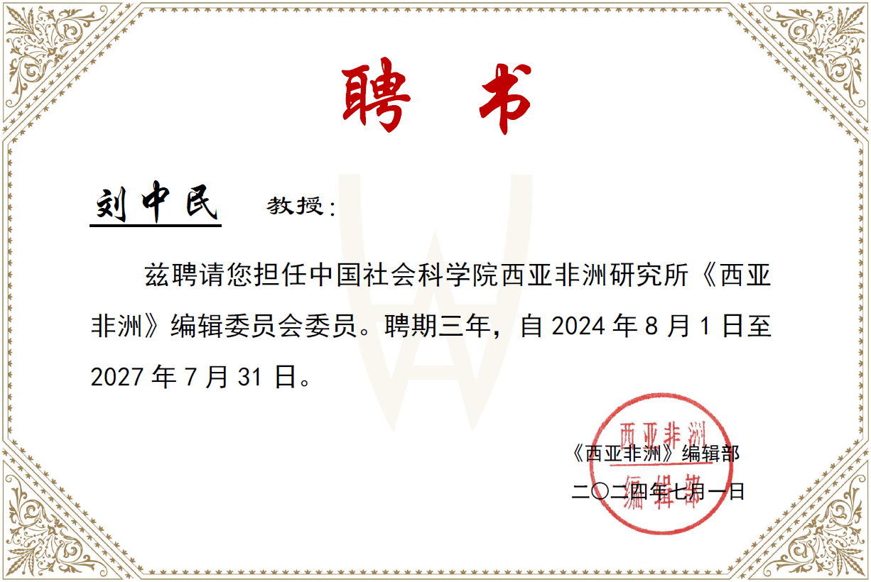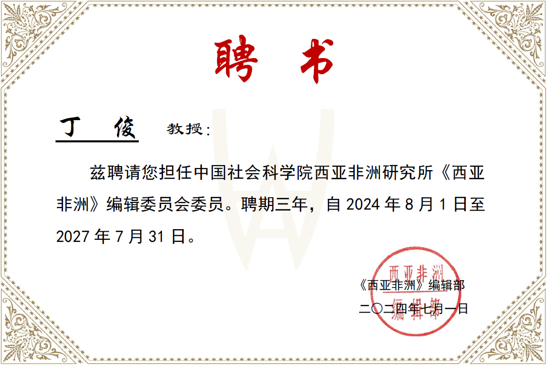 2024年7月,上外中东研究所丁俊教授和刘中民教授被中国社会科学院西亚非洲研究所《西亚非洲》期刊编辑部聘为编辑委员会委员。聘期三年,自2024年8月1日至2027年7月31日。