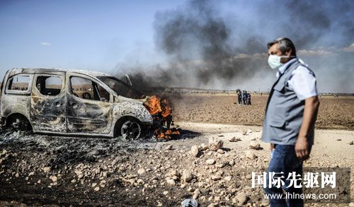 9月22日,土耳其政府关闭边境通道,阻止叙利亚境内库尔德人的涌入,由此引发冲突。图为一名库尔德抗议者经过一辆被焚烧的汽车。法新社