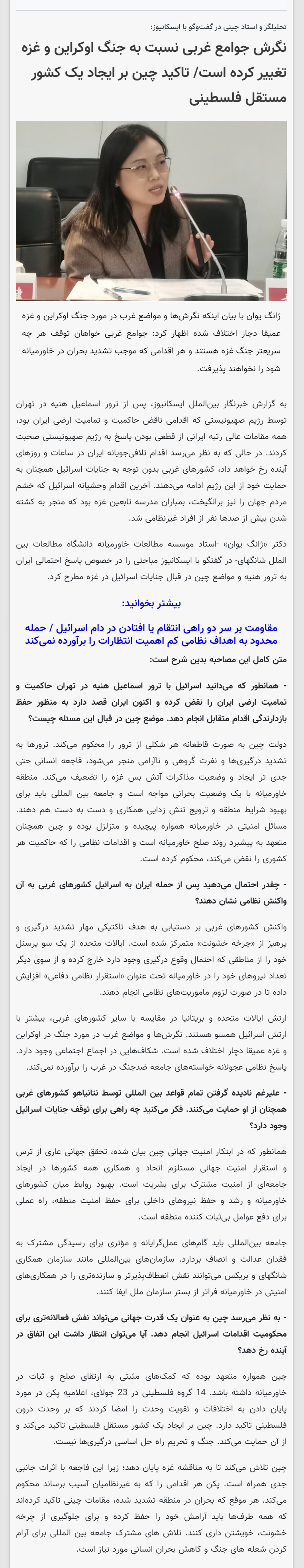 2024年8月13日,上外中东研究所章远研究员就加沙危机和中东紧张局势接受伊朗ISCA通讯社专访,全文如下: