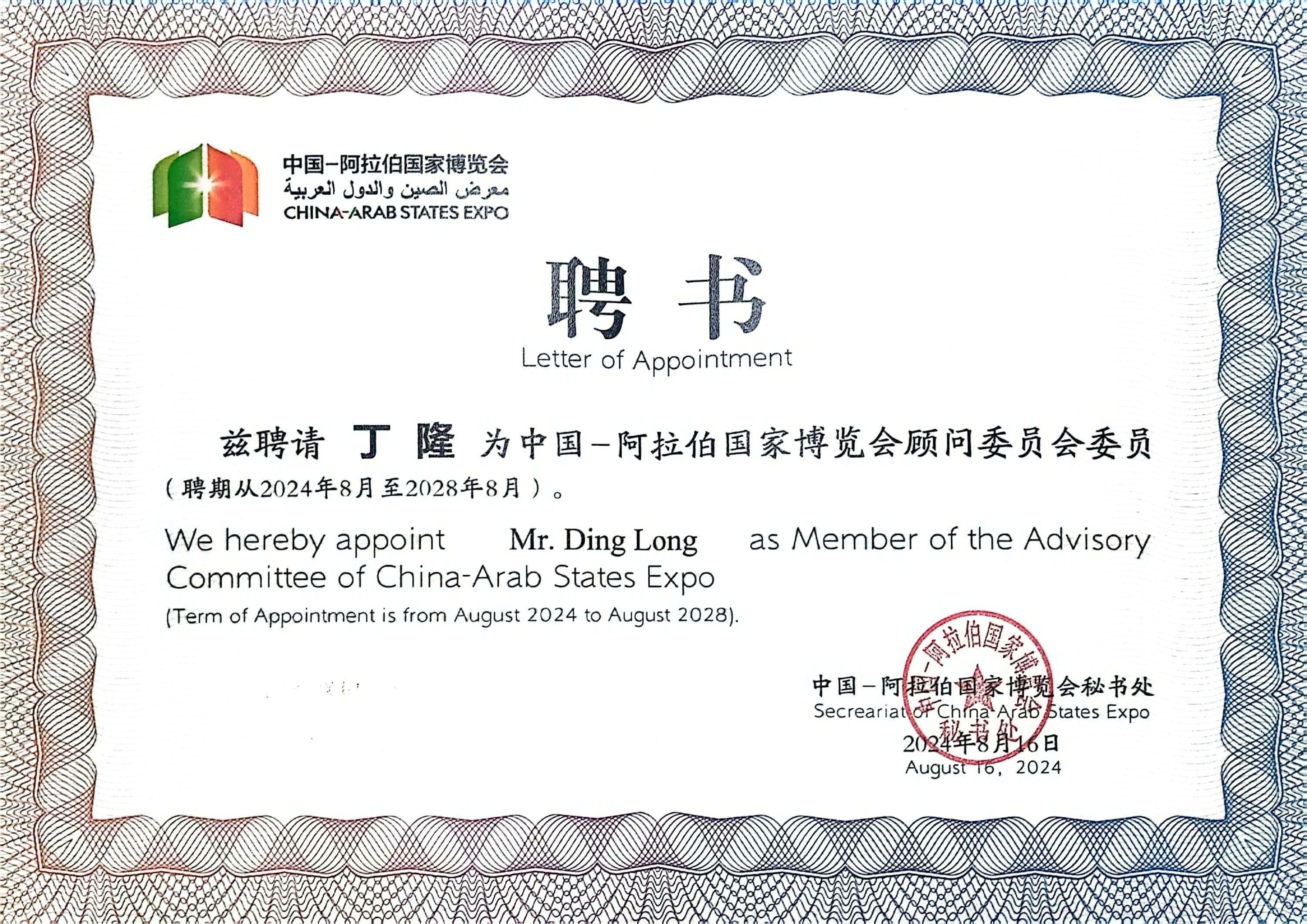 2024年8月,上外中东研究所丁隆教授被中国-阿拉伯国家博览会秘书处聘为中阿博览会顾问委员会委员。聘期四年,自2024年8月至2028年8月。