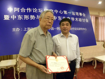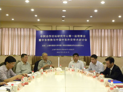 人民网上海9月21日电(记者刘水明)中国—阿拉伯国家合作论坛研究中心第一届理事会会议暨中东形势与中国中东外交学术研讨会今天在上海外国语大学举行。会议通过了理事会章程,确定了今后一个时期研究中心的主要工作任务。与会者还就中东形势与中国中东外交,近两年来政权已更迭的阿拉伯国家发展动态,中东地区格局转型的新特点、新趋势及面临的新问题等议题进行了深入研讨。会议由上海外国语大学教授、中阿合作论坛研究中心主任朱威烈主持。外交部前副部长杨福昌、上海外国语大学副校长周承出席会议并致词。
