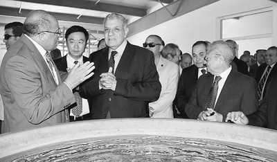 埃及临时政府总理马赫莱卜(左三)在中国援建的苏伊士运河大学渔业与水产教学培训中心视察时,听取情况介绍。(记者 刘水明摄)