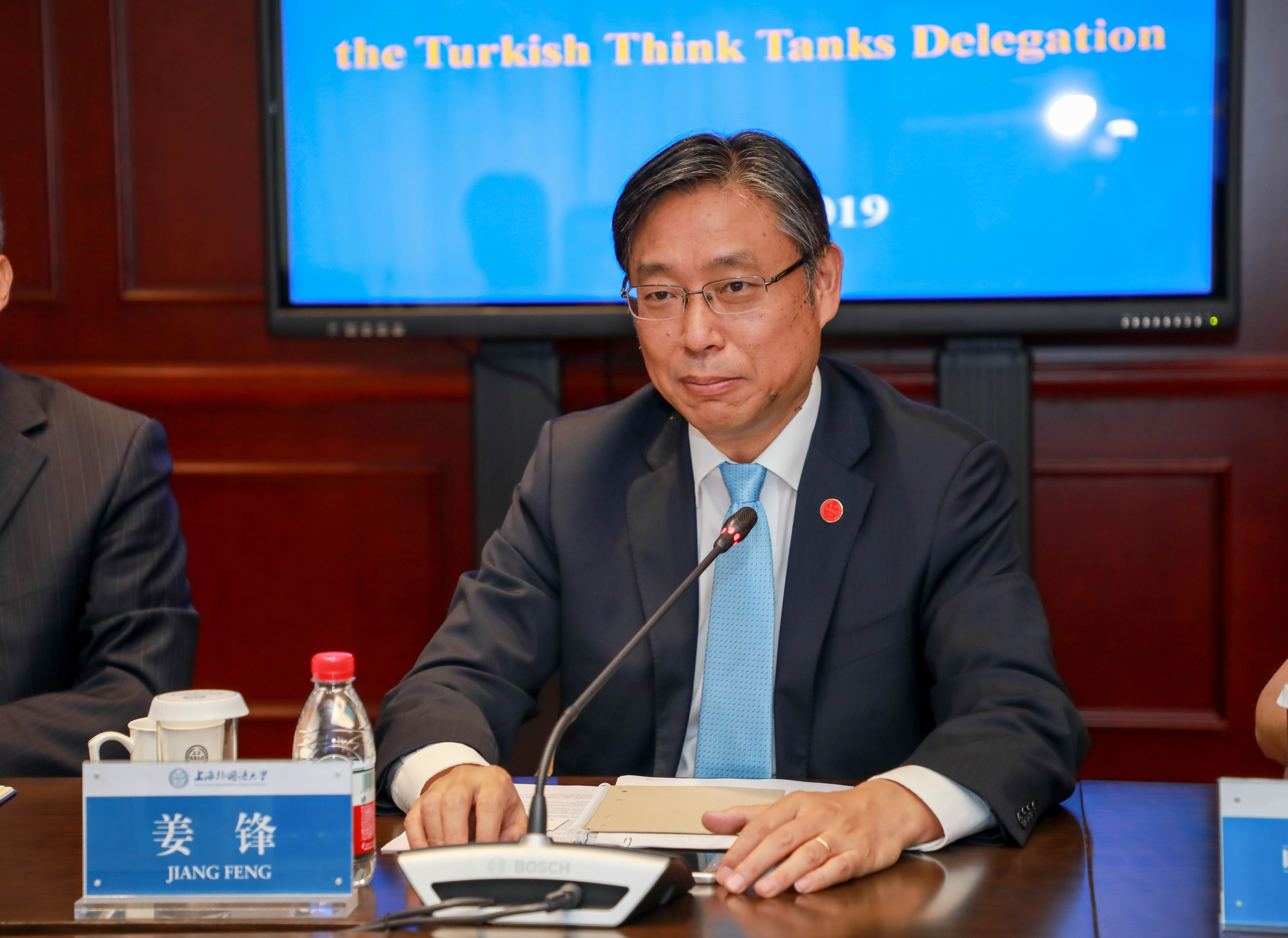 2019年6月19日,土耳其智库学者代表团一行7人在来我校访问交流。校党委书记姜锋热情会见了代表团一行,并同代表团成员举行座谈交流。代表团成员包括土耳其伊朗研究中心代主任Hakkı Uygur博士、中心研究员Murat Aslan教授,土耳其外交学院院长Mesut Özcan,安卡拉耶尔德勒姆·白亚泽特大学Kudret Bülbül教授,GENAR研究咨询机构主席İhsan Aktaş,土耳其国家电视台(TRT World)阿拉伯语频道主任Resul Serdar Ataş以及安卡拉大学神学院Hasan Onat教授等。上外对外合作交流处处长张红玲,中东研究所所长刘中民、包澄章、邹志强,东方语学院韩智敏、王诚等出席交流活动。