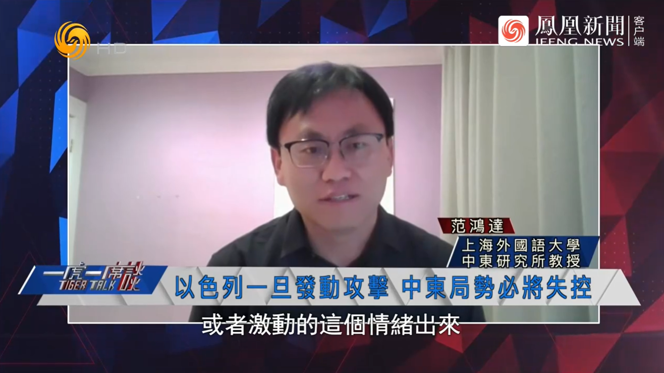 2024年10月19日,上外中东研究所范鸿达教授就中东局势接受凤凰卫视《一虎一席谈》采访(标题:以色列一旦发动攻击 中东局势必将失控)。